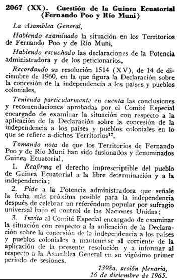 Règim que va veure, com era incapaç d'impedir el reconeixement del dret a l'autodeterminació i independència a les Nacions Unides, tot i que va enviar al President Autonòmic Bonifació Ondó, per relatar que estaven molt feliços de ser espanyols, els havien portat la civilització i tenien una magnífica autonomia i no tenien cap pressa per ser independents, ja que no estaven preparats.